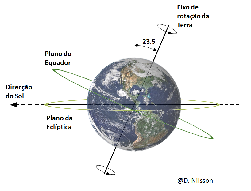 Mas porque temos, afinal, equinócios? O movimento da Terra em torno do Sol “desenha” uma órbita (a Eclíptica) que é inclinada relativamente ao Equador Terrestre. Diga-se desde já que é por esta razão que os globos didácticos usados nas escolas são, frequentemente, construídos tendo o eixo de rotação inclinado relativamente à vertical (a esta inclinação dá-se o nome de Obliquidade da Eclíptica e o respectivo ângulo tem o valor de 23.5 graus). Acontece que o Equador Terrestre intersecta a Eclíptica duas vezes por ano: em Março, originando o Equinócio da Primavera, e em Setembro, dando lugar ao Equinócio de Outono. Estes dias marcam, respectivamente, o início das estações do ano e a duração do dia é igual à da noite: 12 horas de Sol e 12 horas sem ele. Esta constatação milenar está na origem da própria palavra “Equinócio” que vem do latim aequinoctium: aequus (igual) e nox (noite).