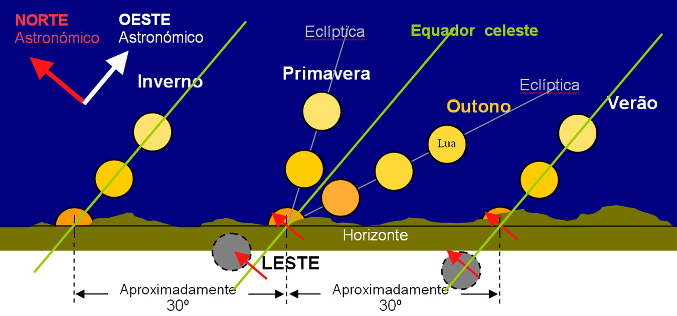 Legenda da figura: Comparação do ângulo da eclíptica em relação ao horizonte, no início de cada estação do ano, no nascimento da Lua-cheia. As setas vermelhas estão igualmente espaçadas entre si, nos esquemas do Outono e do Verão. Escreveu-se "leste", em vez de "este", para evitar confusão com o pronome demonstrativo da mesma grafia.