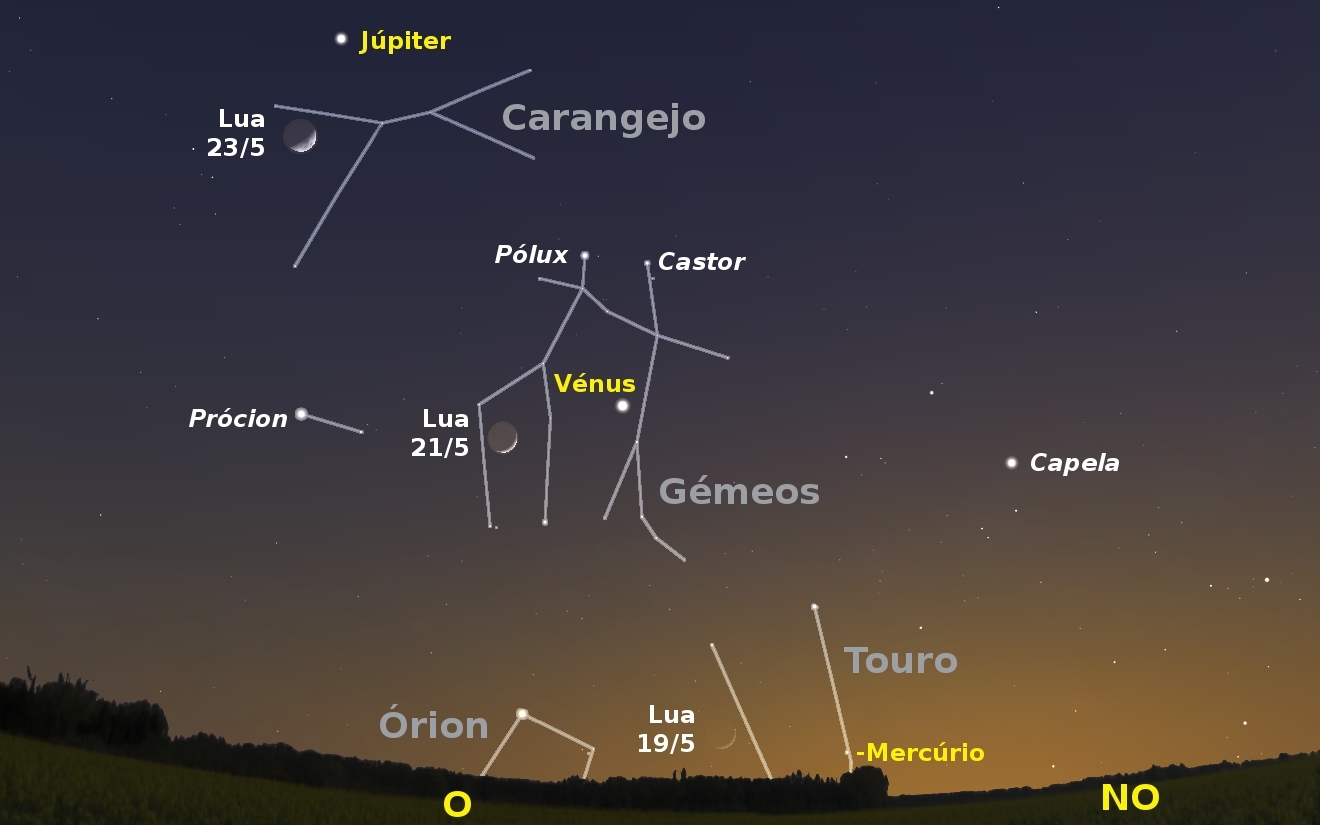 Figura 2: Céu a oeste pelas 19 horas e 30 minutos de dia 19. Igualmente é visível a posição da Lua nos dias 21 e 23.