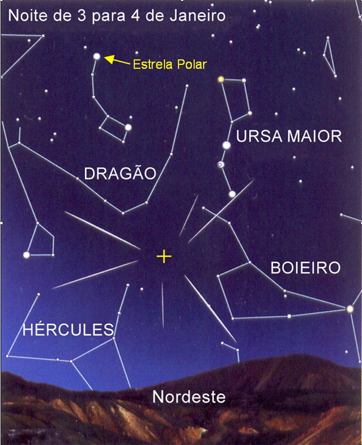Legenda da imagem – Representação do céu na direcção noroeste, com as constelações circundantes. Sugerem-se alguns traços de meteoros e a posição do radiante foi marcada com a cruz (+) amarela.