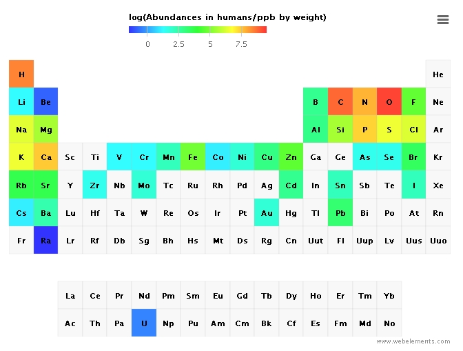 Encontramos nosso corpo 41 elementos químicos diferentes. Alguns em maior quantidade do que outros, naturalmente, mas a variedade é deveras surpreendente! Até podemos ter Ouro (Au) e Urânio (U) em quantidades vestigiais!