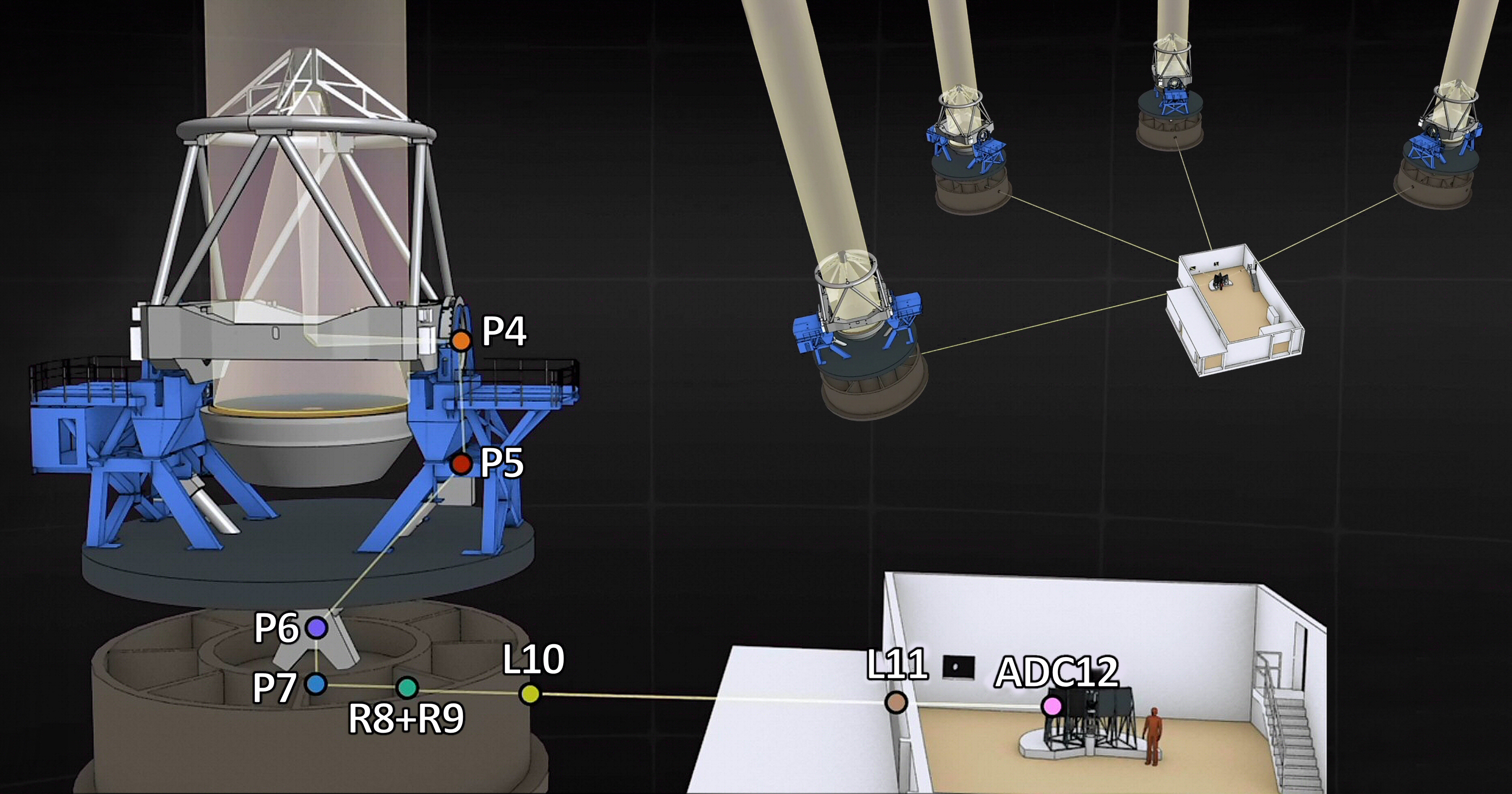 Imagem artística de como o Coudé Train trasnporta a luz, de um dos telescópios VLT até ao ponto de convergência. No canto superior direito, está ilustrada a luz dos 4 telescópios do VLT a chegar ao ESPRESSO. Crédito: Gabriel Perez Días (IAC Serviço Multimedia).
