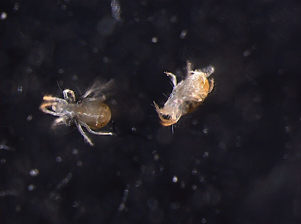Ácaros-aranha (Tetranychus urticae) fotografados com luz normal durante a realização deste estudo. Ácaro-aranha da direita infectado com E. coli, ácaro-aranha da esquerda não foi infetado.