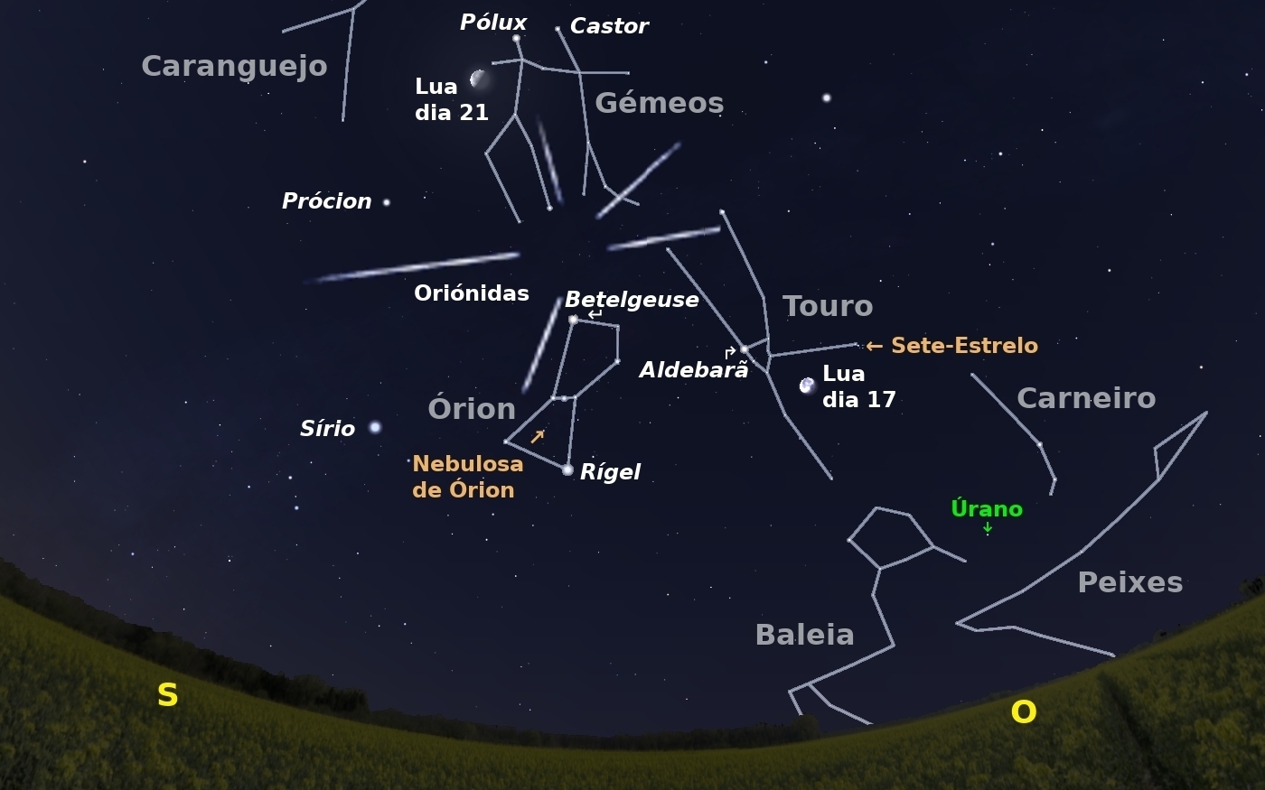 Na noite de dia 21 para 22 coincide tem lugar pico de atividade da chuva de estrelas Oriónidas, pequenas rochas e poeiras libertadas pelo cometa Halley. O nível de atividade desta chuva de meteoros depende de fatores como a fase da Lua ou o tempo decorrido desde a última passagem do cometa. Este ano é de esperar não mais que uma a duas dezenas de meteoros por hora.