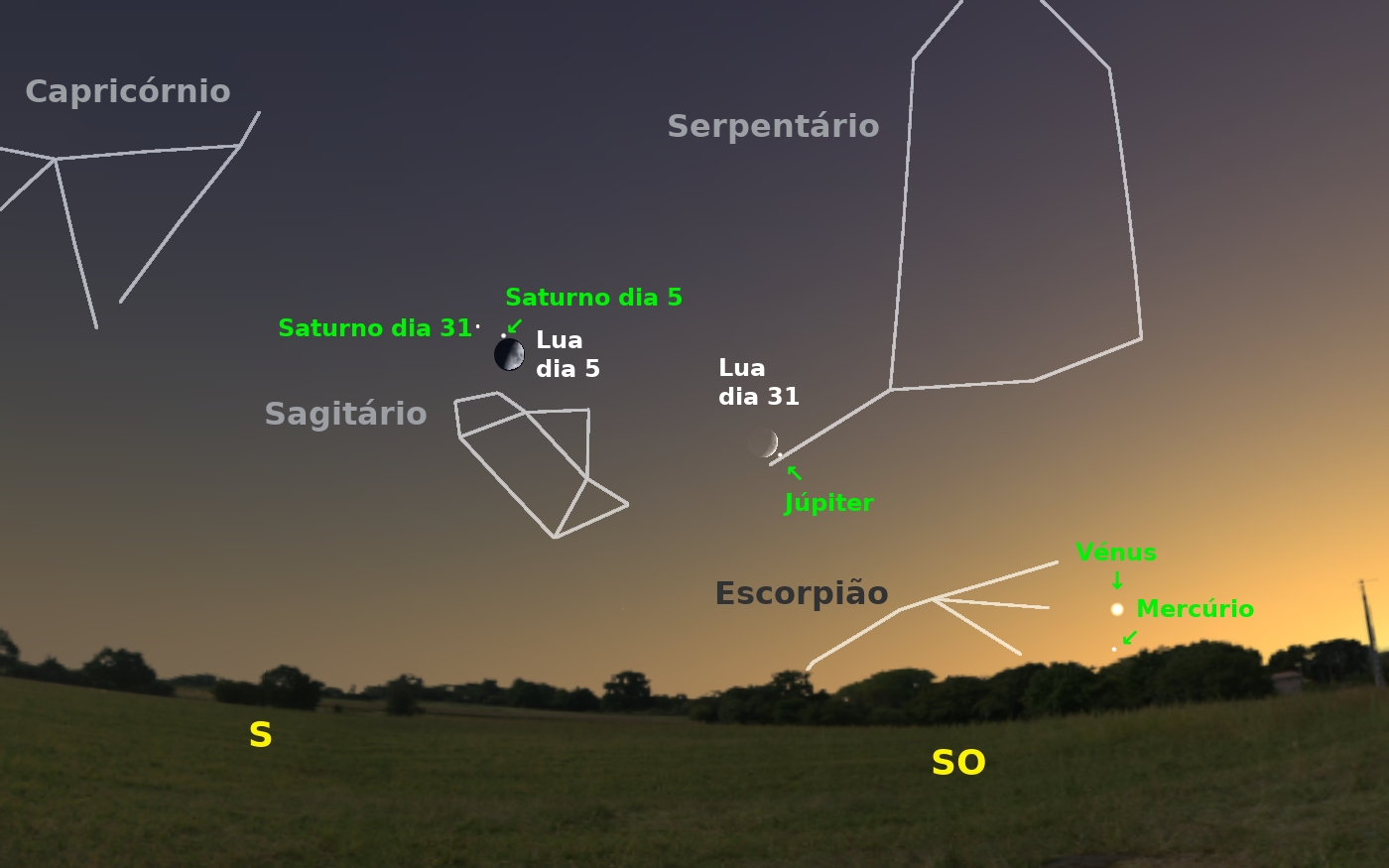 Figura 2: Céu a sudoeste pelas ao início da noite de dia 31. Igualmente é visível a posição da Lua e de Saturno no dia 5.