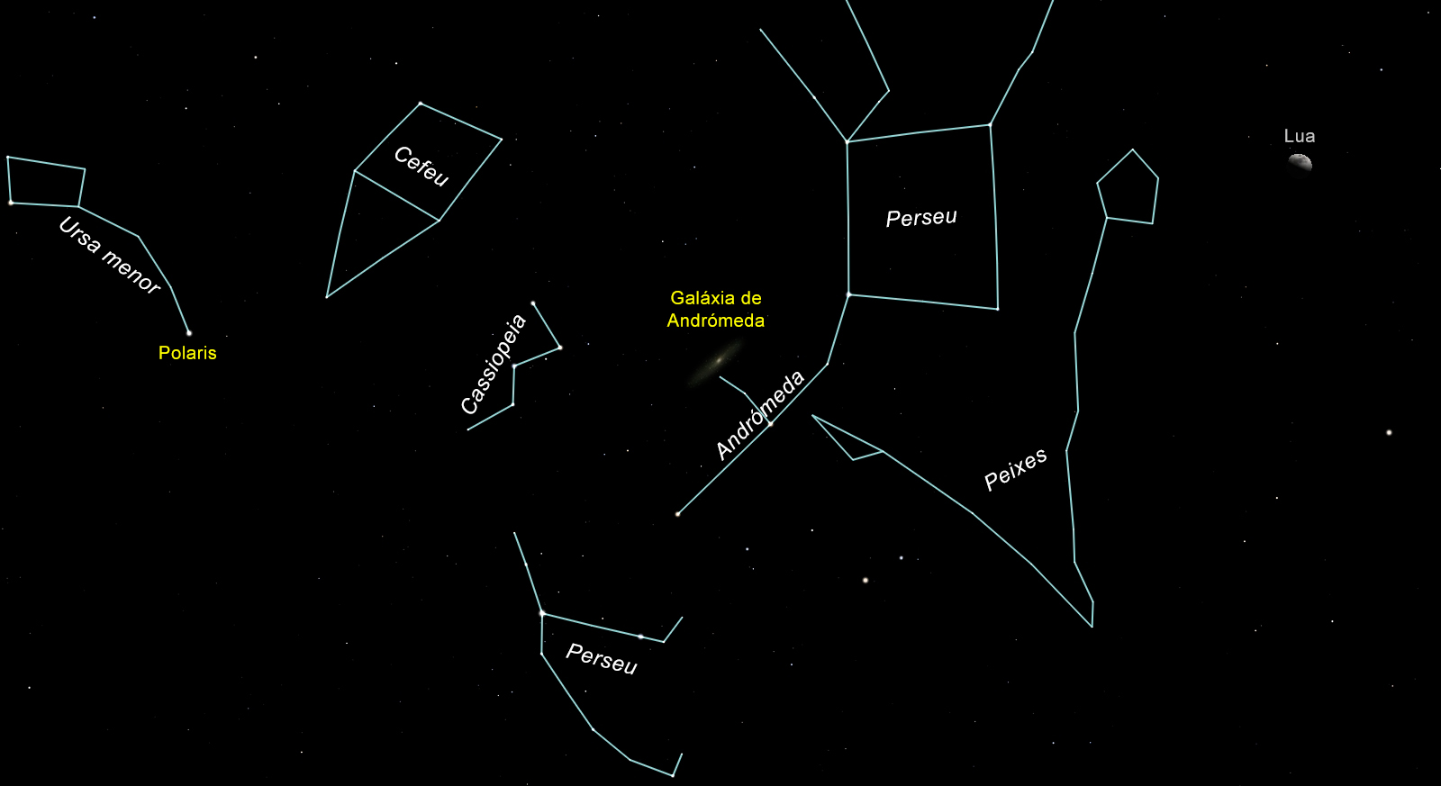 Dia 4 a Lua está em quarto crescente. Nesse dia, se em locais com céus escuros olharem para o zénite (ponto por cima das nossas cabeças) por volta das 20:30 (ou por volta das 19:30 mais para o fim do mês), vão poder ver a galáxia de Andrómeda.