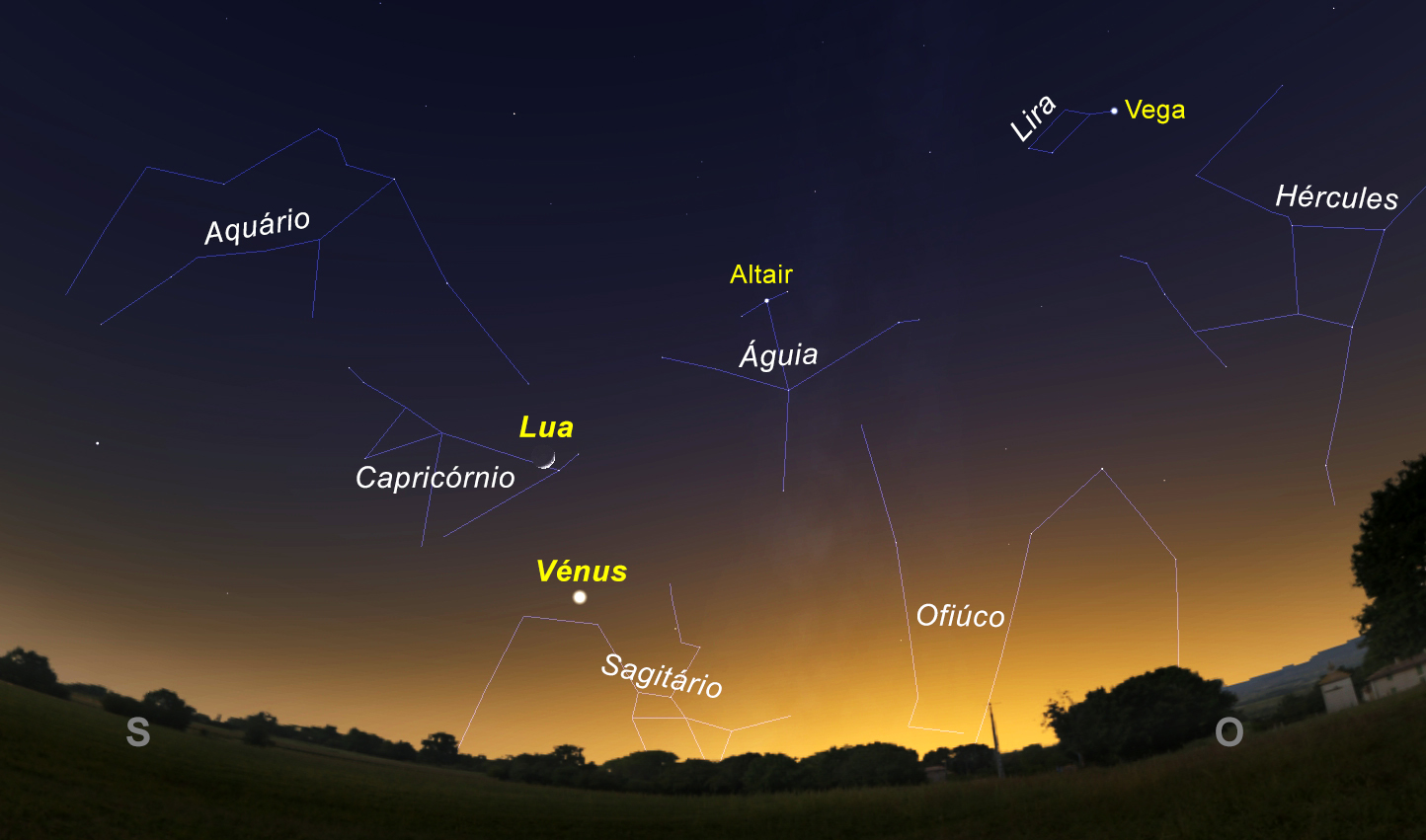 Dia 3 a Lua estará em fase de Lua Nova, e dois dias depois um fino crescente vê-se a 7º de Vénus, planeta que no dia 6 atinge o máximo de brilho, com magnitude a rondar -4,3.