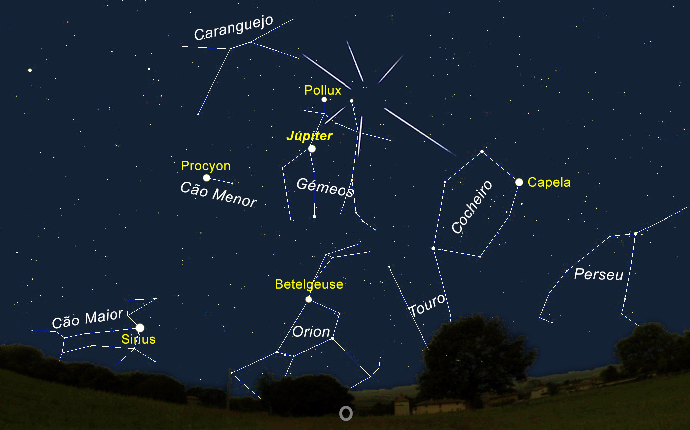 Figura 2: O céu virado a Este, por volta das 5h45 do dia 14 de dezembro 2013, com Júpiter bem próximo do radiante das Geminíadas. (Imagem: Ricardo Cardoso Reis/Stellarium)